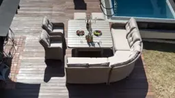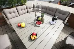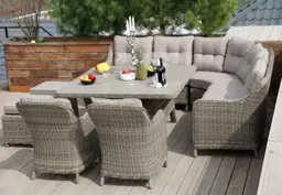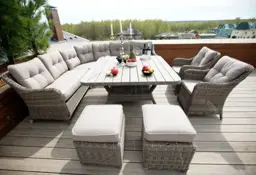 Комплектация | обеденный стол, большой угловой диван с подушками на семь человек, два кресла с подушками, два пуфика с подушками |